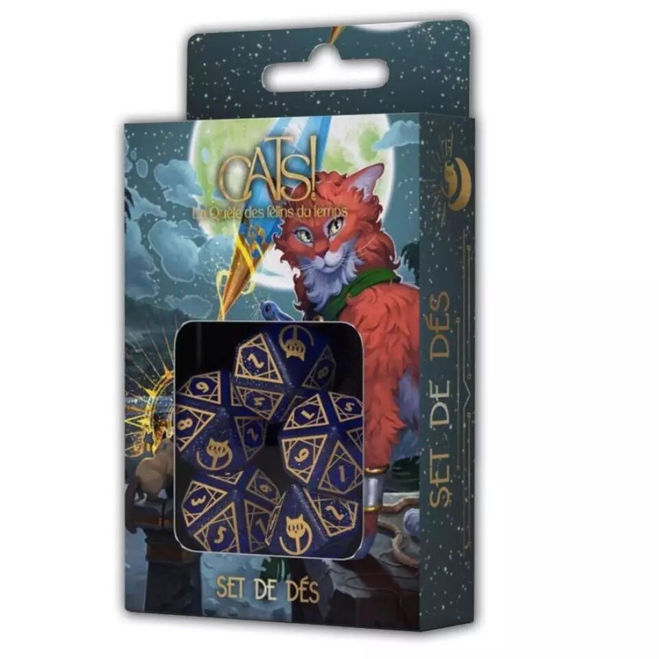 Un magnifique set de cinq dés à dix faces ornés du logo de Cats ! La mascarade, spécialement conçus pour la campagne la  Quête des félins du temps.