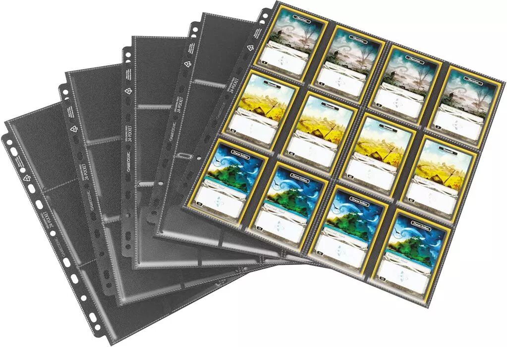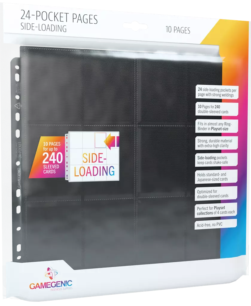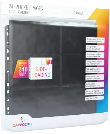 Ces pages comportent 24 pochettes à chargement latéral qui protègent parfaitement même les cartes à double sleeve. Grâce à leur dos à 11 trous, ces pages s'adaptent à presque tous les classeurs à anneaux au format Playset.