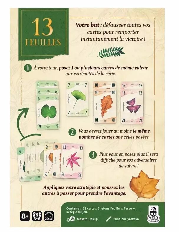 Les cartes illustrées de feuilles aux tons doux renforcent la sensation d’un jeu zen mais nerveux. 13 Feuilles s’installe facilement à table, promettant un moment aussi agréable pour les yeux que stimulant pour le cerveau.
