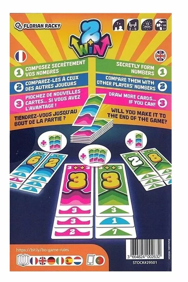2 Win, c’est la promesse de rassembler petits et grands autour d’une table pour des parties où la stratégie légère et la prise de risque sont à l’honneur. Facile à prendre en main, il s’adresse autant aux enfants dès 7 ans qu’aux adultes en quête d’un jeu rapide à sortir lors d’une soirée jeux ou d’un apéro. Son format compact permet de l’emporter partout, pour improviser une partie à tout moment et faire découvrir le plaisir du jeu de société à tous.