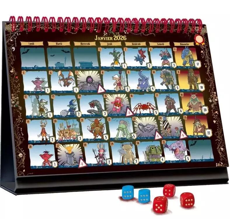 Chaque jour, avancez votre héroïne sur la case du calendar-game, lancez vos cinq dés jusqu’à trois fois et affrontez le monstre de la semaine. Chaque mois introduit un nouveau chapitre, des règles inédites et des artefacts magiques. Plus qu’un calendrier, c’est une véritable aventure qui se vit pas à pas.