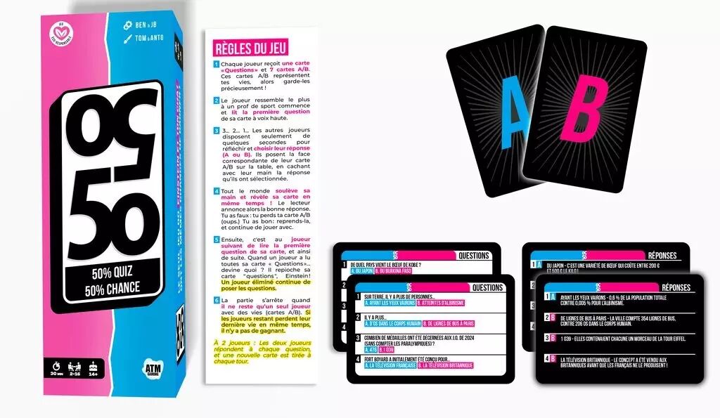50/50 s’impose comme le jeu d’ambiance parfait pour dynamiser toutes tes soirées. Son format compact et ses 240 cartes permettent de l’emmener aussi bien au resto qu’en voyage. La qualité des matériaux séduit dès l’ouverture, avec des cartes épaisses prêtes à encaisser les revanches et les éclats de rire entre amis ou en famille.