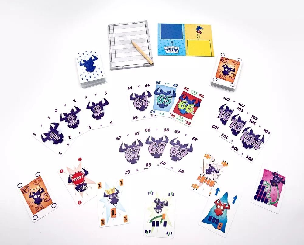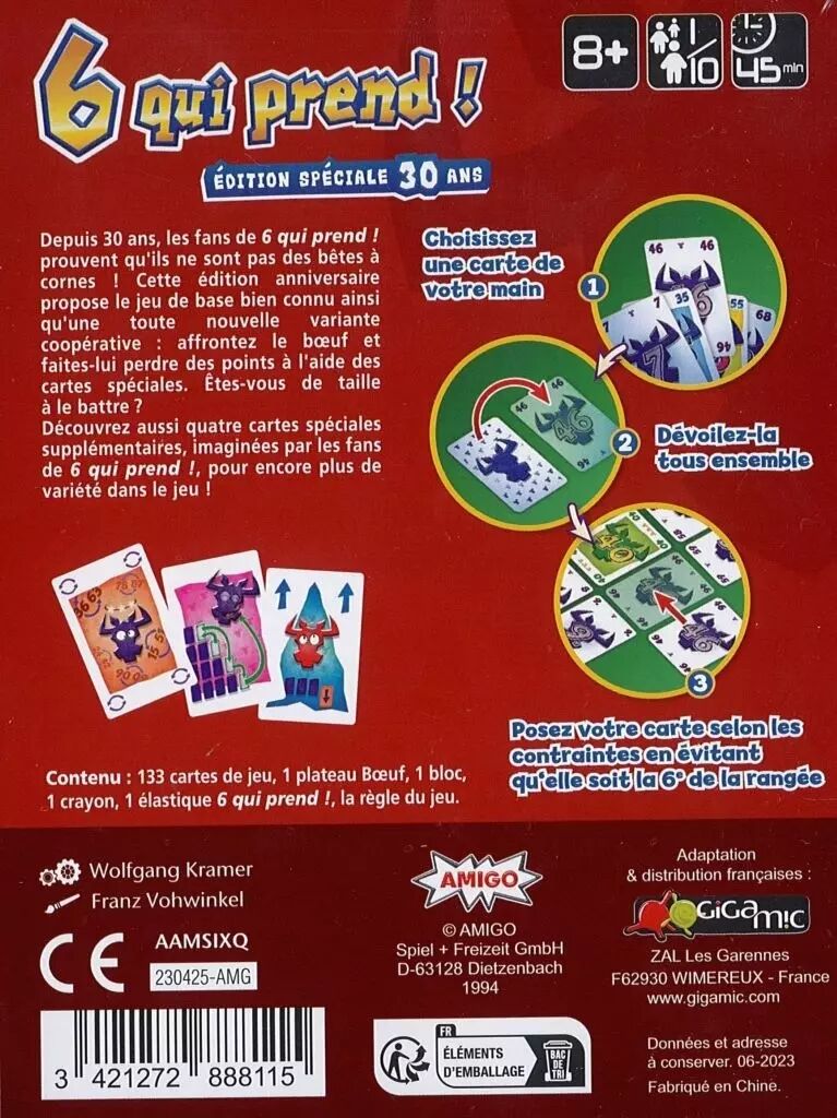 Jouez vos cartes numérotées dans l’une des quatre rangées, mais réfléchissez-bien pour éviter de subir des vacheries. Dans 6 qui prend !, celui qui joue la sixième carte d’une série doit en ramasser les cinq premières, et les points négatifs qui viennent avec ! Dans cette édition anniversaire, le jeu de base s’accompagne de quatre cartes spéciales de fans qui vont diversifier vos parties et les rendre plus amusantes.