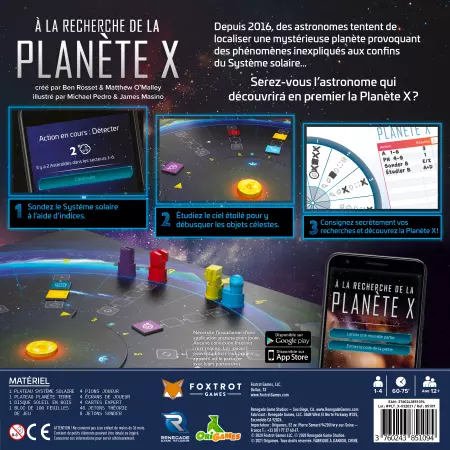 Dans ce jeu de logique et de déduction, vous jouez des astronomes observant le ciel ?étoilé, rivalisant d'ingéniosité pour déterminer l'emplacement de cette mystérieuse planète. Détectez les corps célestes à l'aide d'indices, explorez les connaissances en astronomie, notez secrètement vos résultats et découvrez en premier la Planète X !