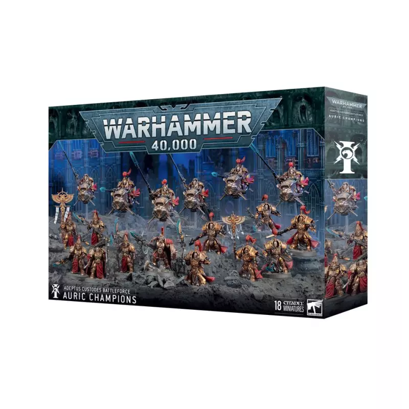 Défendez le Trône d'Or avec les guerriers suprêmes de cette boîte! Cette puissante force est menée par un noble Capitaine-rempart armé d'une lance Pyrithite, une nouvelle figurine disponible pour la première fois dans cette boîte. Il mène cinq Veilleurs Custodiens et six invincibles Custodiens Allarus en somptueuse armure Terminator, tandis que six Praetors Vertus volent au-dessus de leurs têtes sur des motojet Dawneagle.