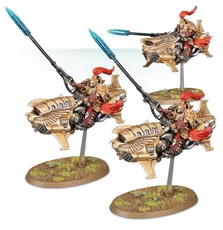 Les escouades de Vertus Praetors plongent au combat sur de puissantes motojets Dawneagle. Vétérans ayant combattu sur des centaines de mondes, ces Custodians connaissent la véritable valeur de la vitesse, qui n’est pas simplement d’engager l’ennemi, mais aussi de diriger leur force où et quand elle est requise. S’ils voient leurs camarades en mauvaise posture, les Vertus Praetors frappent telle la foudre pour les soutenir. Dans un rugissement, ils survolent le champ de bataille, pour déborder et encercler les véhicules ennemis les plus lourds – même les aéronefs les craignent, car en conjuguant leurs tirs, les Vertus Praetors tissent une toile de projectiles que les appareils adverses percutent avec des résultats fatals.