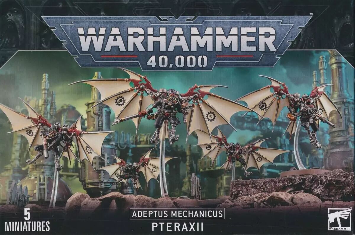Les Pteraxii sont une des nombreuses castes spécialisées de soldats cyborgs dont dispose l’Adeptus Mechanicus, optimisés pour l’agilité et les réactions instinctives. Les réflexes des Pteraxii sont accentués en leur retirant des éléments cognitifs qui gênent leur fonction primaire. On leur implante des articulations supplémentaires sur l’omoplate, un paquetage de propulseurs et des surfaces vivantes réactives. Ces paquetages de vol deviennent une part intégrante des Pteraxii, qui jouent plusieurs rôles. Les Sterylizors, par exemple, sont affûtés pour l’agression, et leurs pieds sont remplacés par des serres acérées. Ils ratissent les temples-forges pour les purger des infestations de techparasites et de cybercloques, et les Tech-Priests n’hésitent pas à utiliser les torches à phosphore des Sterylizors contre les adversaires intelligents.