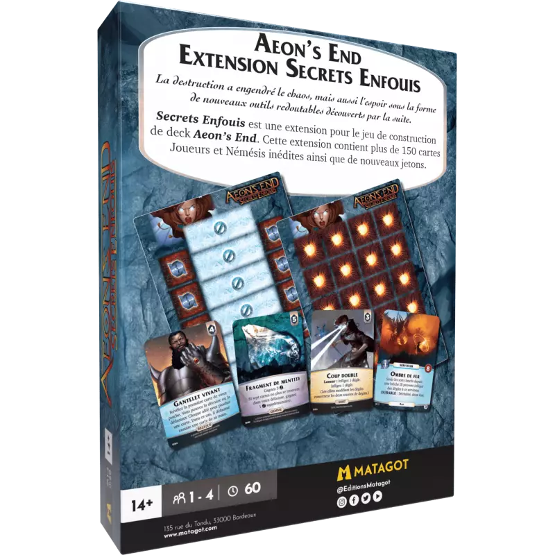 Secrets Enfouis est une extension pour Aeon's End. Elle contient plus de 150 cartes Joueurs et Némésis inédites ainsi que de nouveaux jetons.