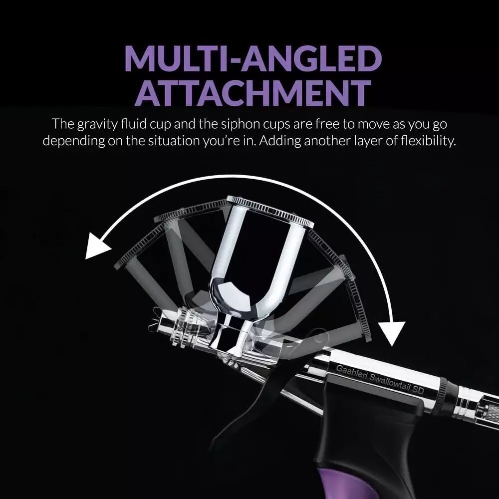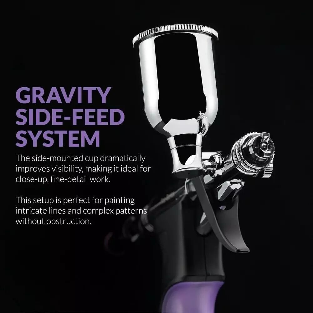 L'atout majeur est la polyvalence de son alimentation. Contrairement aux modèles à gravité classique, le godet latéral peut pivoter à 360°, vous permettant de peindre dans des angles complexes ou sous le modèle sans risque de renverser la peinture.