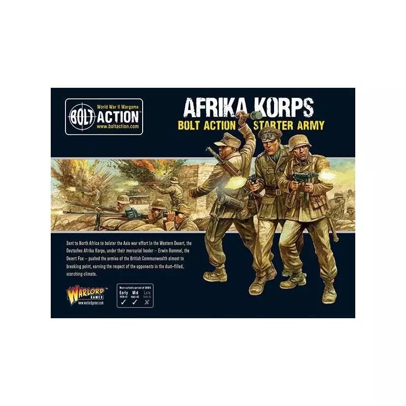 Sous le commandement d'Erwin Rommel, surnommé le « Renard du désert », l'Afrika Korps se fit connaître pour ses manœuvres audacieuses dans les conditions extrêmes du désert occidental. Malgré un environnement hostile, ces troupes parvinrent à tenir tête aux armées britanniques, avec un mélange équilibré d'infanterie, de blindés et d'artillerie. Ce set inclut notamment le célèbre canon antichar « 88 », un Panzer III et plus de 30 soldats, offrant tout ce qu'il faut pour démarrer des affrontements dans le sable brûlant du désert.