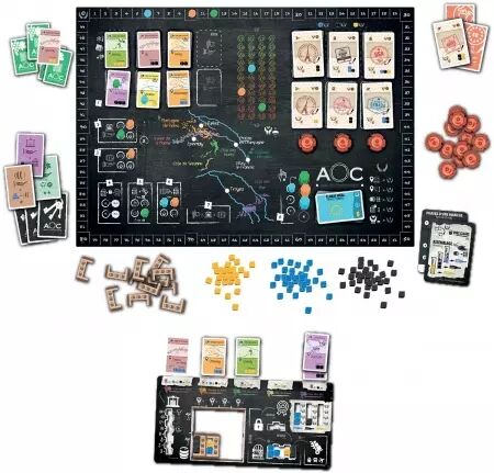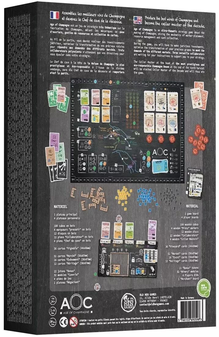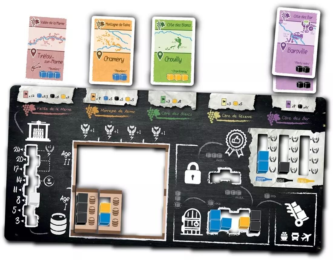 Age of Champagne est un jeu de stratégie très thématique sur la fabrication du Champagne, mêlant les mécaniques de pose d’ouvriers, gestion de ressources et collection de cartes. Au fil de la partie, vous devrez réaliser des investissements judicieux, optimiser la transformation de vos précieux raisins pour répondre aux demandes des différents marchés. Trois collaborateurs polyvalents n’attendent que vos directives pour vous épauler dans votre stratégie.