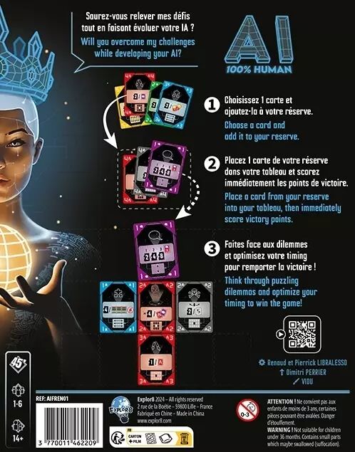AI 100% Human vous plonge dans un monde de construction d'intelligences artificielles via un système ingénieux de création de tableaux. Chaque tour vous permet d'ajouter une carte Évolution à votre tableau personnel, en veillant à respecter les contraintes d'optimisation et les objectifs fixés par le jeu. Votre tableau évolue au fur et à mesure, rendant chaque décision plus cruciale que la précédente.