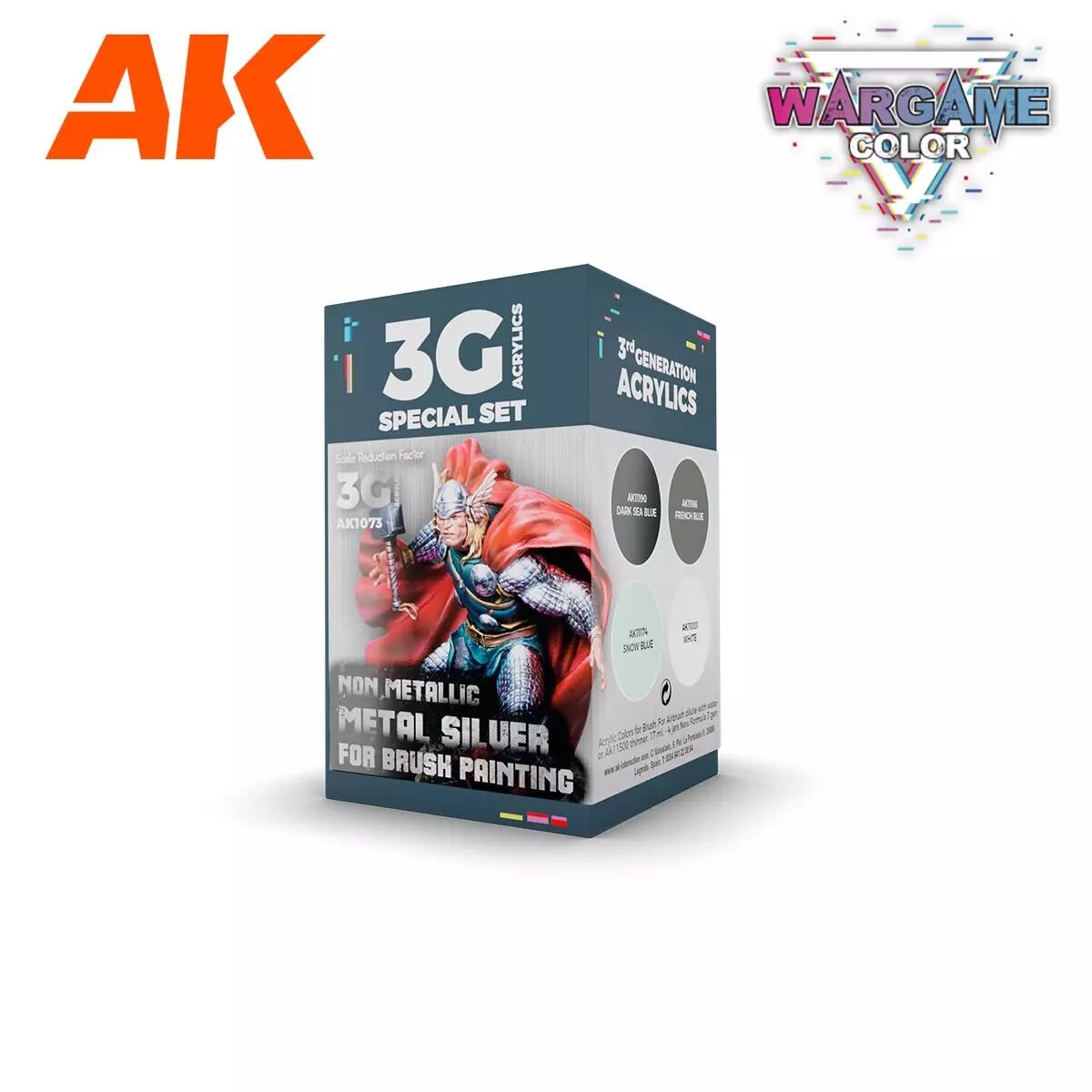 Réf. : AK1073 Ce set de troisième génération contient une sélection de couleurs pour peindre des effets argentés NMM sur les figurines et les accessoires. Il comprend 4 tons à combiner pour appliquer la technique du métal non métallique.