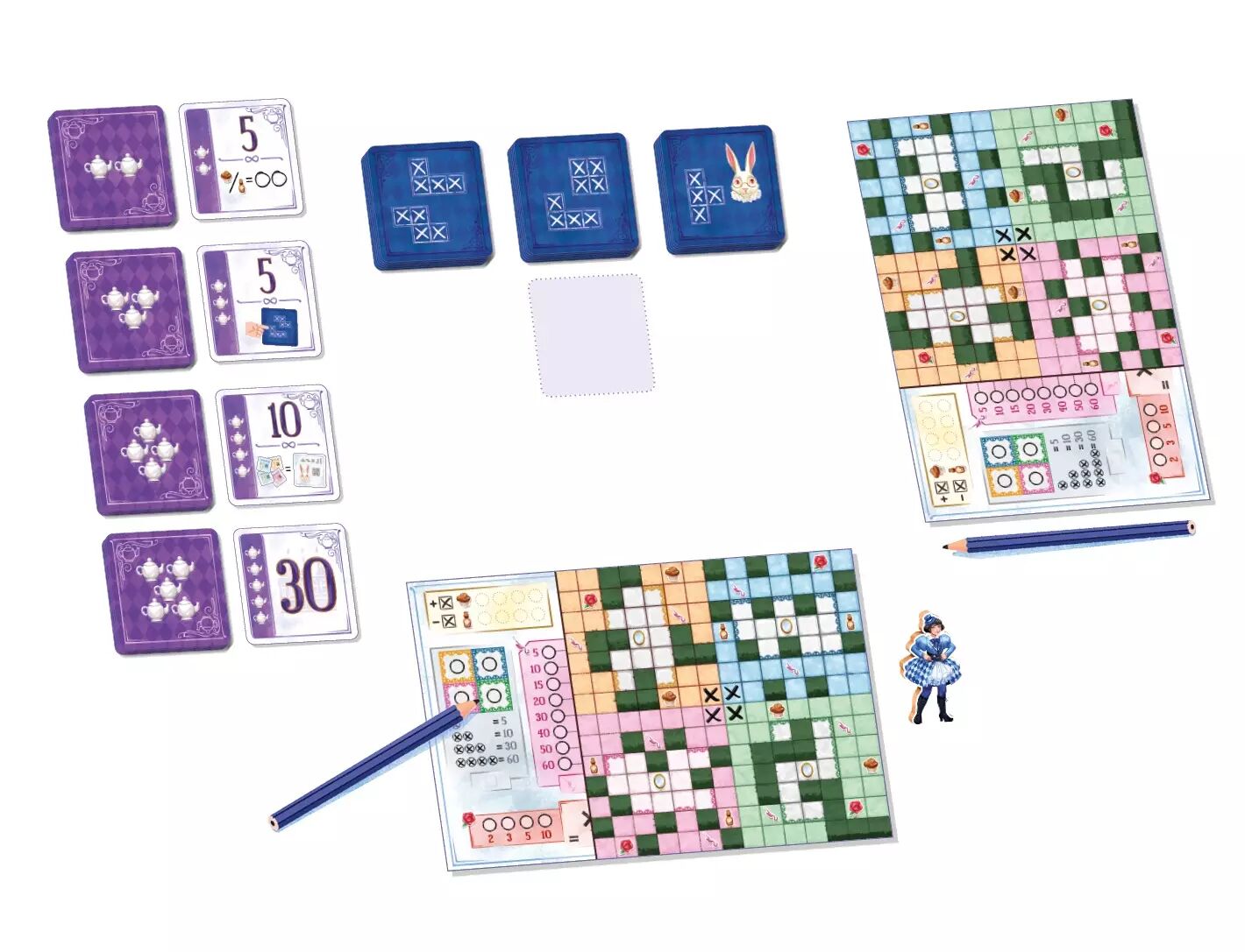 Alice est un jeu à cocher compétitif où chaque joueur doit reproduire sur sa fiche les formes révélées au centre de la table. À chaque tour, une carte Forme est retournée : tous les joueurs tracent la forme sur leur fiche en respectant des règles de placement simples mais tactiques. Certaines cases déclenchent des bonus : agrandir ou réduire une forme, marquer des points ou activer des effets. Le twist : la fiche est recto-verso, et on la retourne en cours de partie en traversant un miroir ! Un système de zones colorées et d’icônes à optimiser enrichit les choix. Un mode équipe complète l’expérience pour des parties en duo avec des objectifs asymétriques. Le scoring croisé et les multiples interactions entre les éléments rendent chaque partie vivante, fluide et maline.