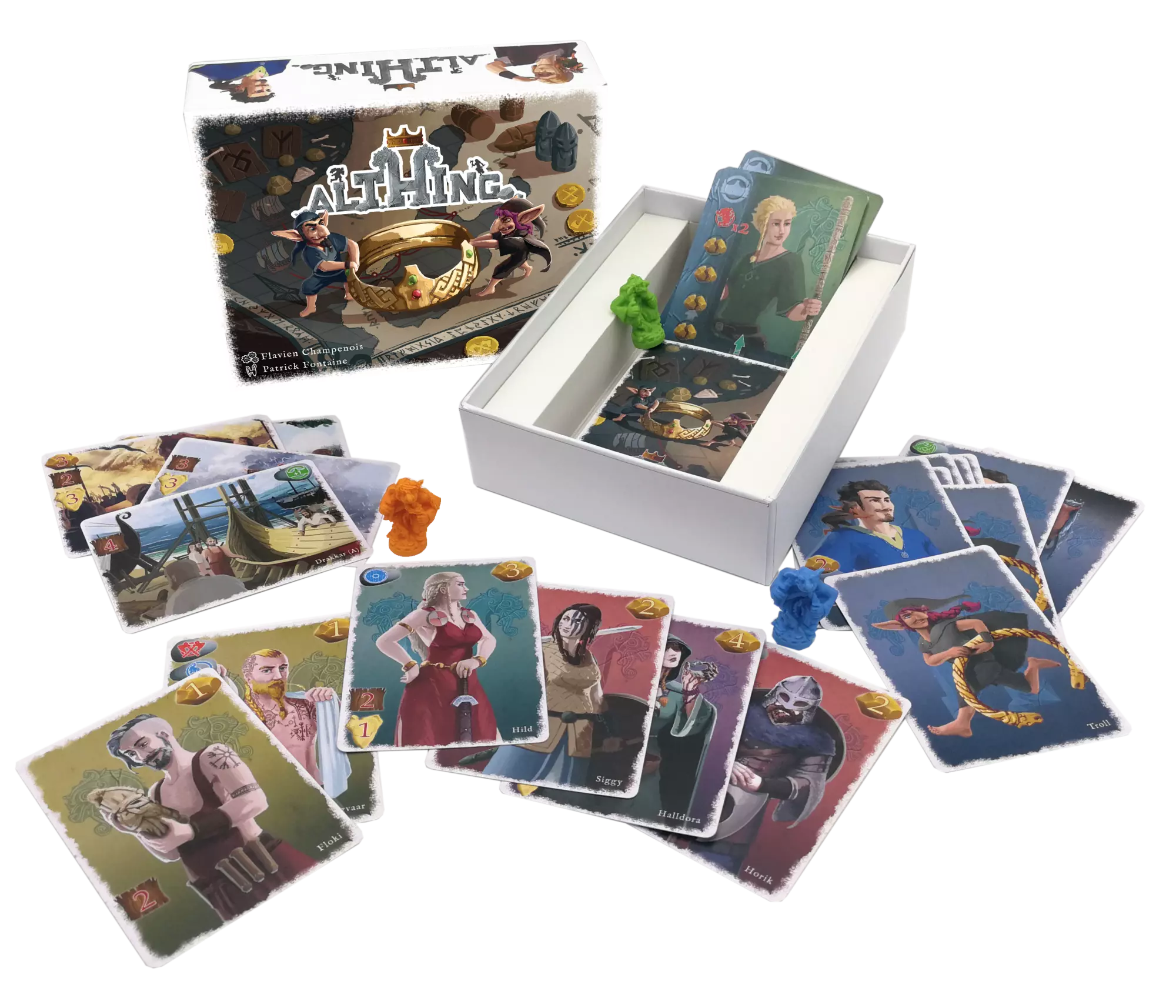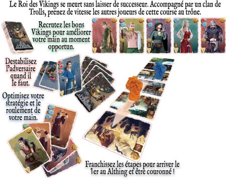 Althing est un jeu de course pour deux joueurs avec roulement de main sur fond de deckbuilding ! Jouable également à trois joueurs ou en solo.