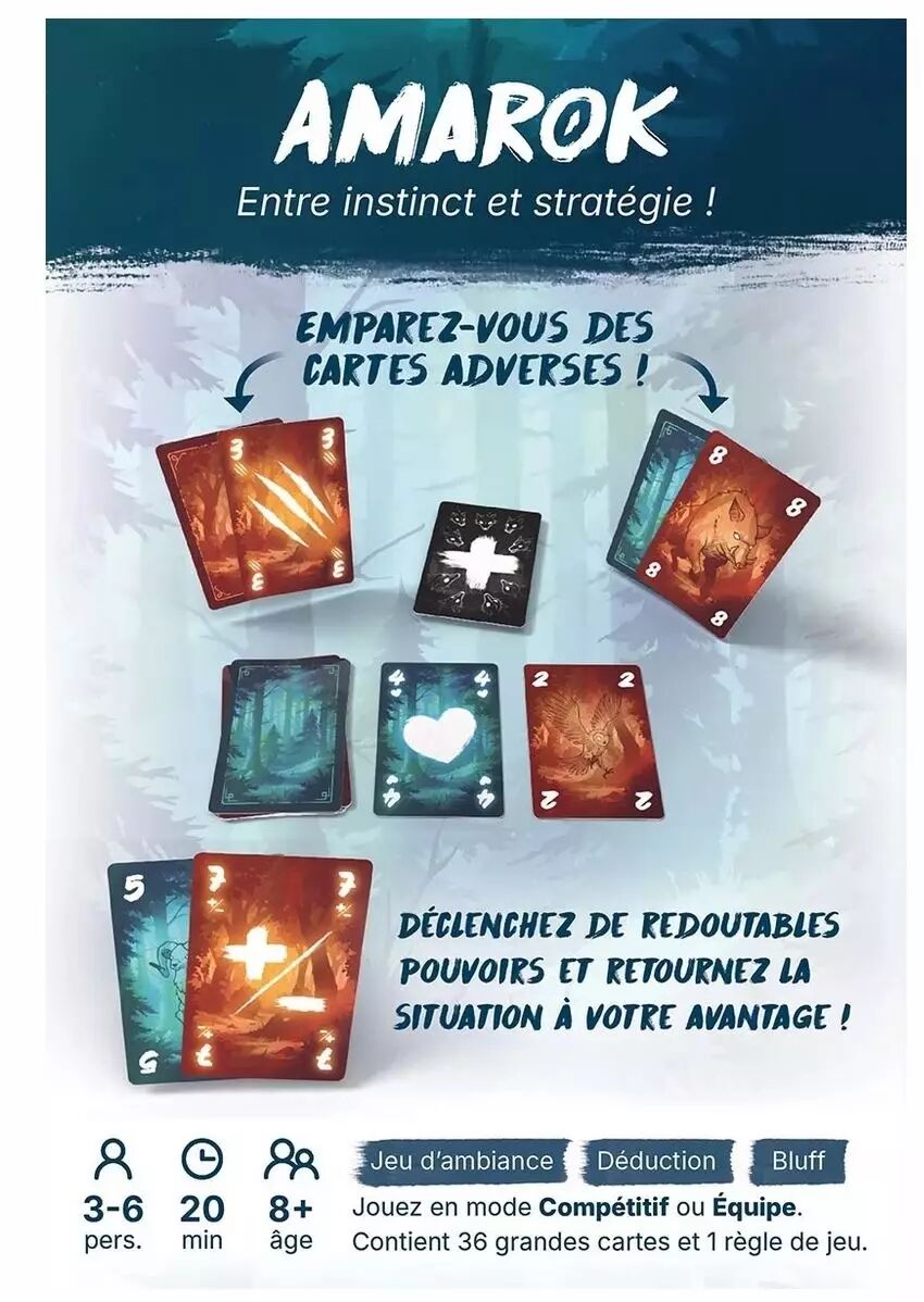 Amarok est idéal pour les amateurs de jeux d'ambiance tactiques qui apprécient le bluff et la mémoire. Il convient parfaitement aux groupes d'amis ou aux familles cherchant un jeu rapide (20 min) avec une forte interaction sociale. Que vous jouiez en solo contre tous ou en équipe, chaque décision peut renverser l'équilibre de la forêt.
