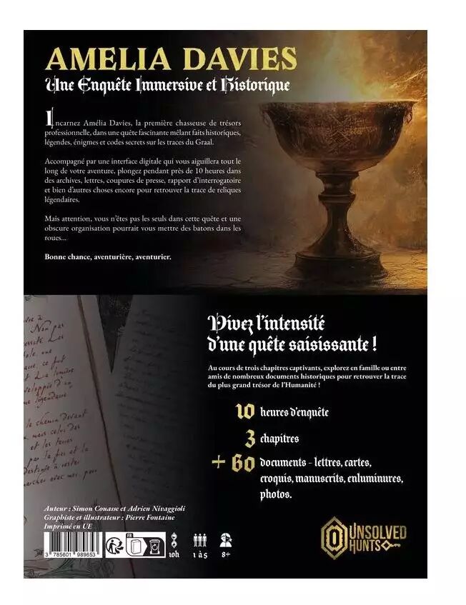 Amelia Davis : La Quête du Graal transporte les joueurs dans une aventure palpitante, où chaque indice vous rapproche du plus grand secret de la légende arthurienne. L’histoire, découpée en trois chapitres, vous fait voyager à travers des lieux mystérieux et vous plonge dans une intrigue riche en rebondissements. L’ambiance est portée par des documents d’époque, des plans, des archives et des objets qui rendent chaque découverte unique et authentique.