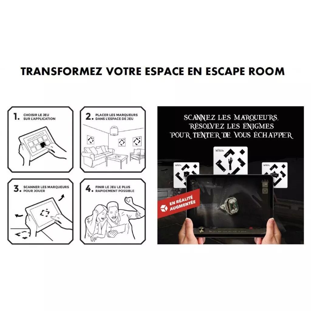Transformez votre salon en Maison Hantée en disposant simplement les cartes « marqueurs » autour de vous (sur une table, un mur, un meuble...). Avec votre smartphone ou tablette et l'application mobile gratuite, affichez les objets virtuels qui font maintenant partie de votre pièce. Pour sortir de votre nouvelle demeure, il faudra vous entraider pour percer le secret du manoir...