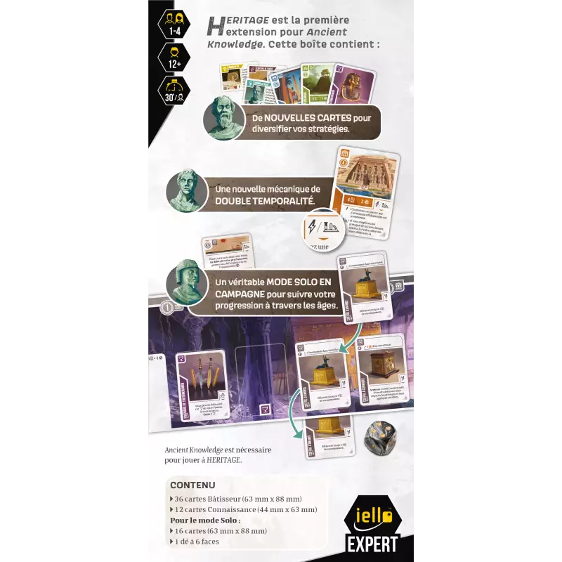 Avec ses 36 nouvelles cartes de constructeur et 12 cartes de technologie, l’extension Ancient Knowledge : Héritage enrichit le jeu de base en vous offrant des combinaisons inédites. Chaque partie devient unique grâce à cette diversité, et vous devrez réfléchir encore plus finement pour exploiter pleinement les nouvelles opportunités.