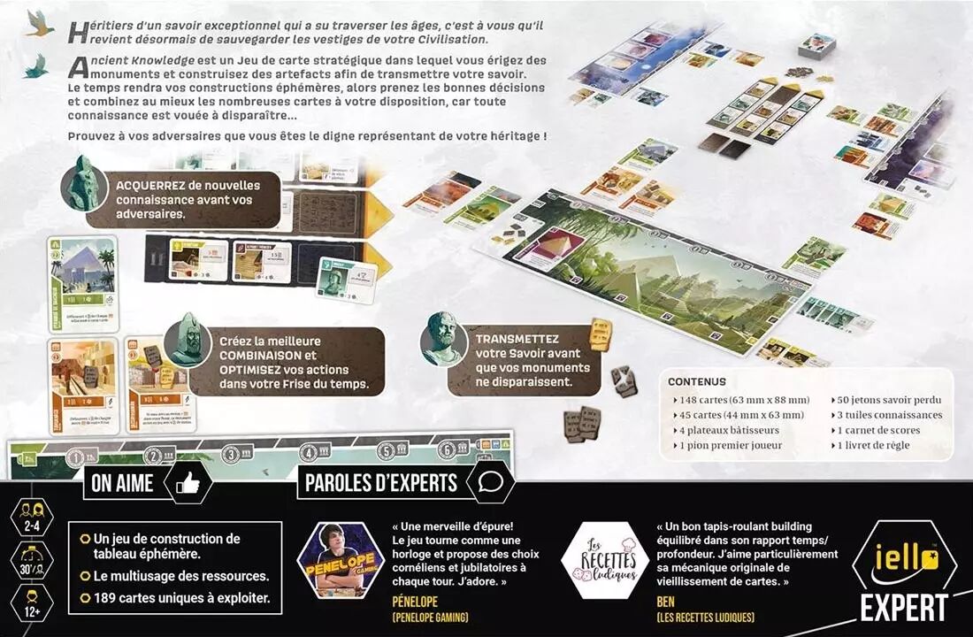Nouveauté IELLO Expert, Ancient Knowledge est un jeu de cartes stratégique dans lequel vous érigez des monuments et construisez des artefacts. Votre but : transmettre vos connaissances à travers le temps. Ce dernier rendra en effet vos constructions éphémères, les condamnant peu à peu à l’oubli.