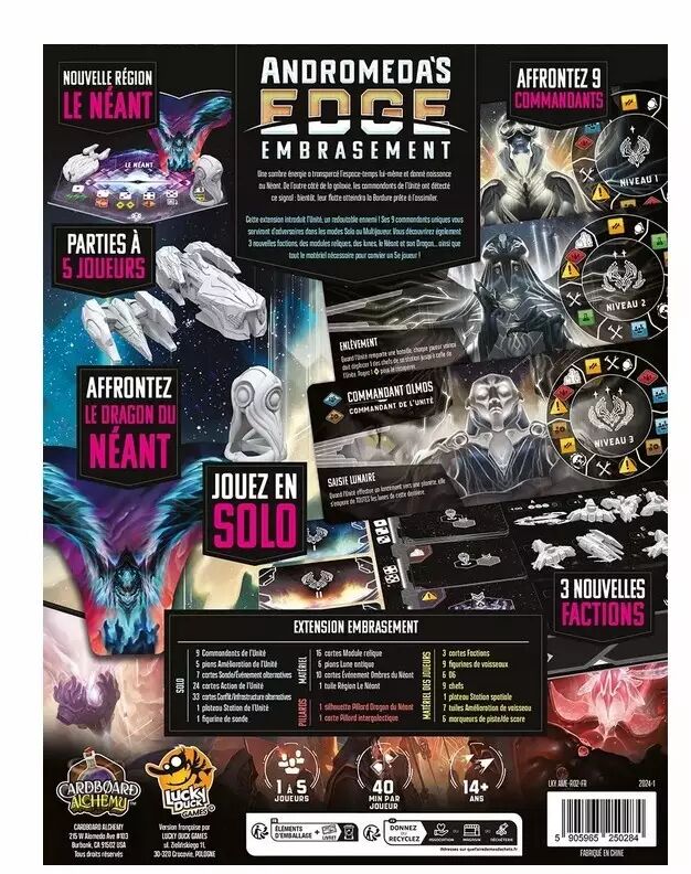 Ce qui distingue Embrasement, c’est sa capacité à transformer vos parties d’Andromeda’s Edge. Le mode solo offre un challenge relevé pour les stratèges en quête de défis personnels, tandis que l’ajout d’un cinquième joueur dynamise les affrontements et multiplie les stratégies. Les nouvelles factions et modules apportent une rejouabilité exceptionnelle, chaque partie réservant son lot de surprises et de retournements.