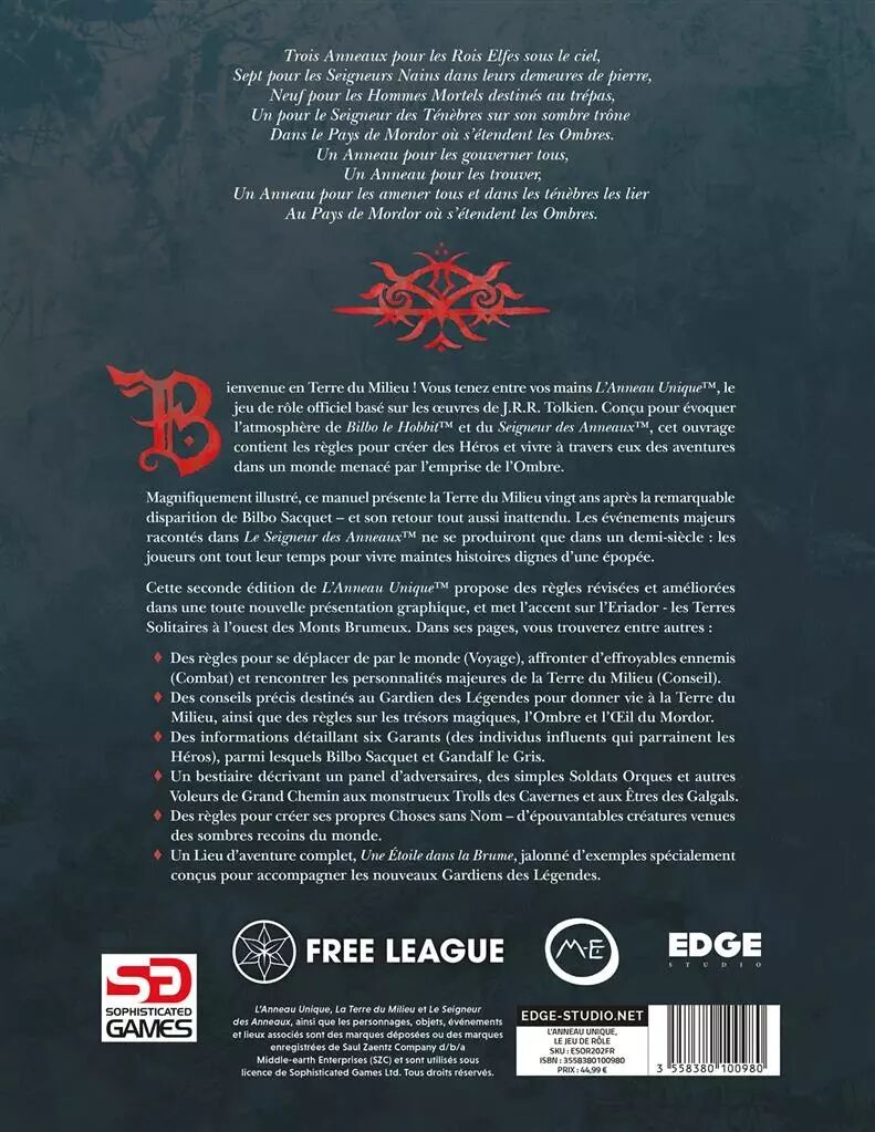 Cette seconde édition de L’Anneau Unique™ propose des règles révisées et améliorées dans une toute nouvelle présentation graphique, et met l’accent sur l’Eriador — les Terres Solitaires à l’ouest des Monts Brumeux. Dans ses pages, vous trouverez des règles pour se déplacer de par le monde, affronter d’effroyables ennemis et rencontrer les personnalités majeures de la Terre du Milieu. Vous y trouverez également un bestiaire, des règles sur les trésors magiques, sur la corruption, des conseils pour le Gardien, un lieu d’aventures décrit en détail, et des informations sur six Garants parmi lesquels Bilbo Sacquet et Gandalf le Gris.