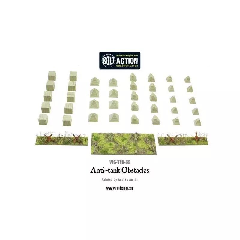 Réf. : WG-TER-39 Renforcez la défense de vos champs de bataille avec cet ensemble d'obstacles antichars en plastique, conçu pour bloquer ou ralentir les véhicules blindés ennemis dans vos parties de Bolt Action.