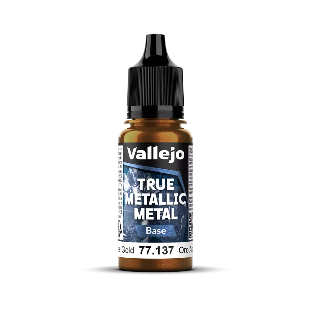 La gamme True Metallic Metal de Vallejo met fin aux compromis : pour la première fois, vous obtenez de vraies métallisations éclatantes sans sacrifier la saturation des couleurs ni la facilité d'application. Chacune des 80 peintures acryliques est organisée en 20 familles chromatiques cohérentes, fonctionnant selon un système simple et puissant : Base (pinceau ou aérographe), Shade (pour les ombres) Light (pour les reflets) ou système BSL.