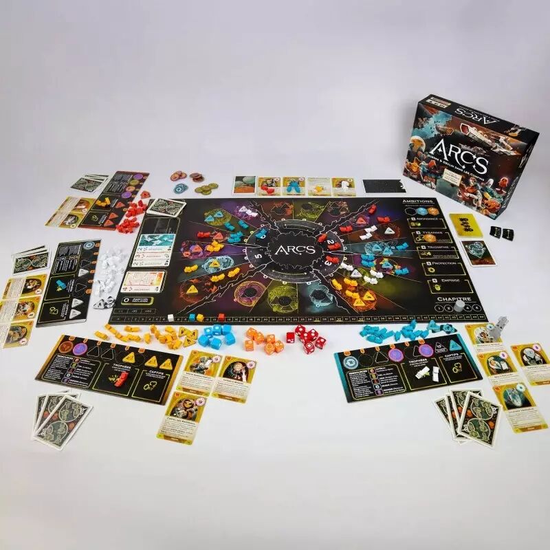 Arcs se distingue par sa mécanique de choix d’actions inspirée du jeu de plis : à chaque tour, vous jouez une carte pour déterminer vos actions, forçant à anticiper et à s’adapter en permanence. Le système d’ambitions, qui définit les objectifs de chaque manche, pousse à la prise de risque et à l’opportunisme. Les parties sont rythmées, les choix toujours cruciaux, et la tension ne retombe jamais, que vous soyez en pleine conquête ou en train de défendre vos positions.