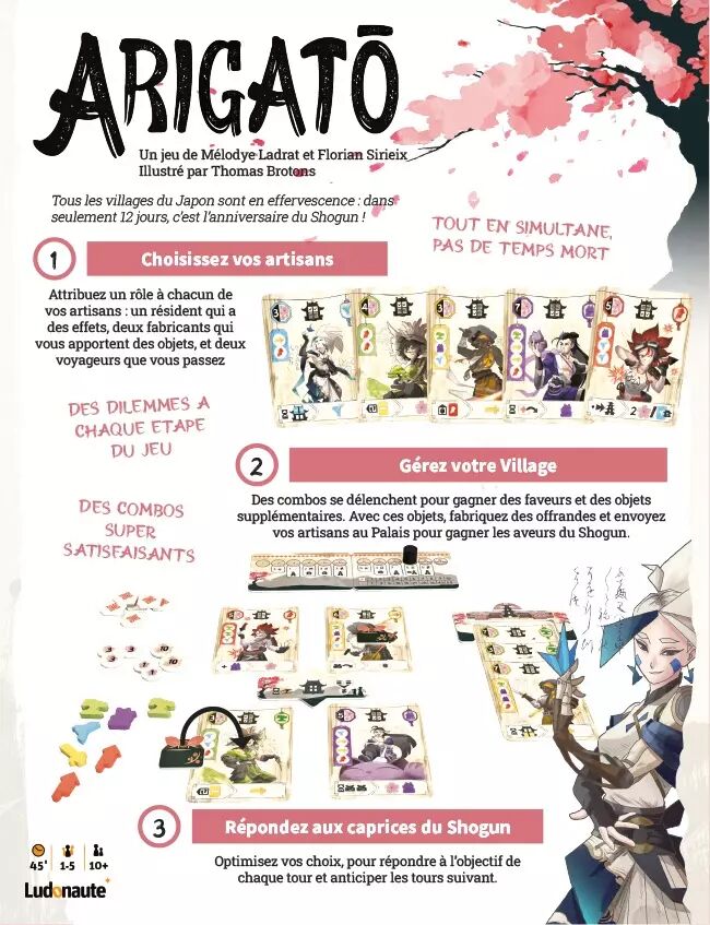 Avec 100 cartes artisans, différents plateaux village et porte, plus de 60 jetons objet et de multiples objectifs, chaque session d’Arigato prend une saveur inédite. L’alternance entre gestion, anticipation et adaptation, couplée à des graphismes apaisants et tactiles, en fait un jeu à ressortir à chaque soirée ludique pour de nouvelles aventures pleines de surprises.