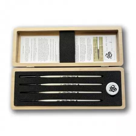 Fabriqués en poils de martre Kolinsky, ces pinceaux offrent une pointe précise et une excellente capacité de rétention de la peinture. Comparés aux Raphael 8404 ou aux Broken Toad MkIII, ils tiennent parfaitement la route.