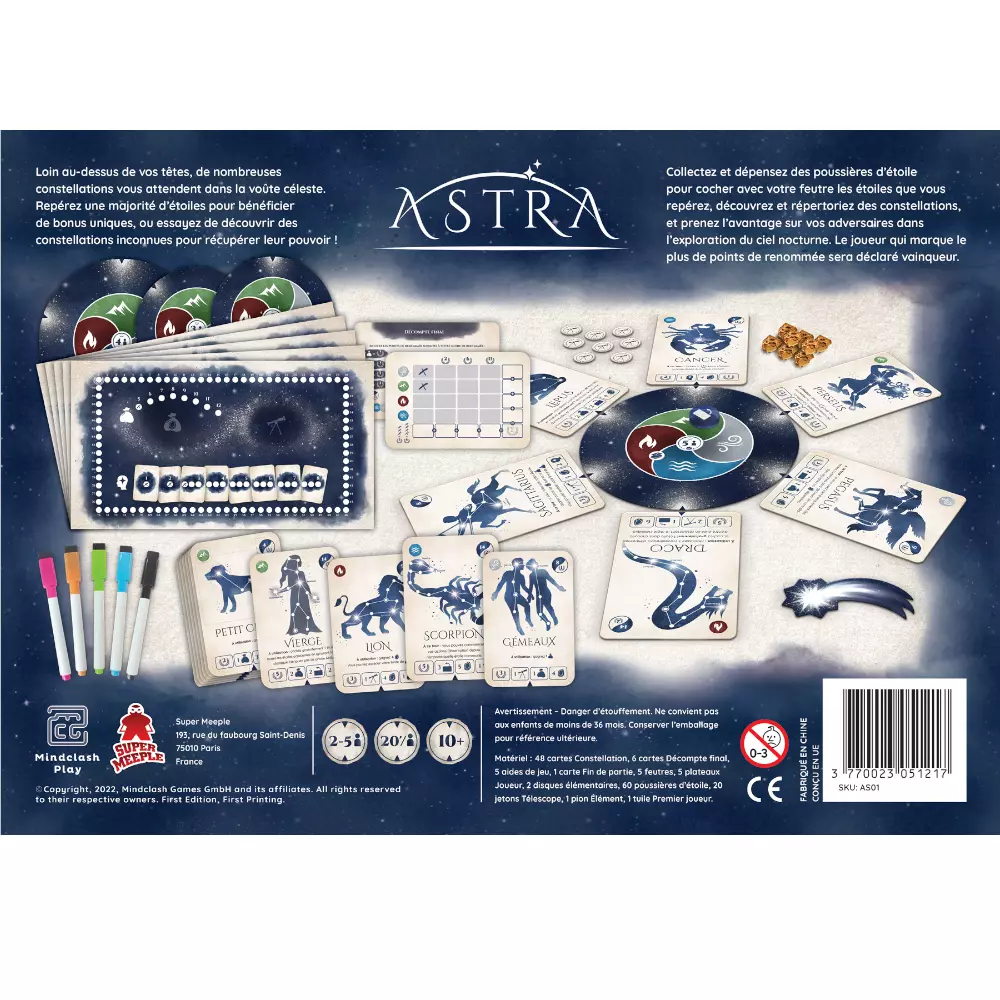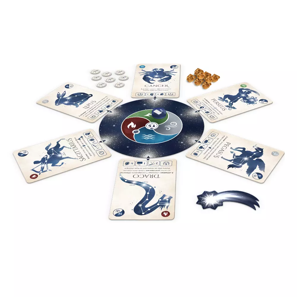 Collectez et dépensez des poussières d'étoile pour cocher de votre feutre les étoiles que vous repérez, découvrez et répertoriez des constellations, et prenez l'avantage sur vos adversaires dans l'exploration du ciel nocturne. Le joueur qui marque le plus de points de renommée sera déclaré vainqueur.