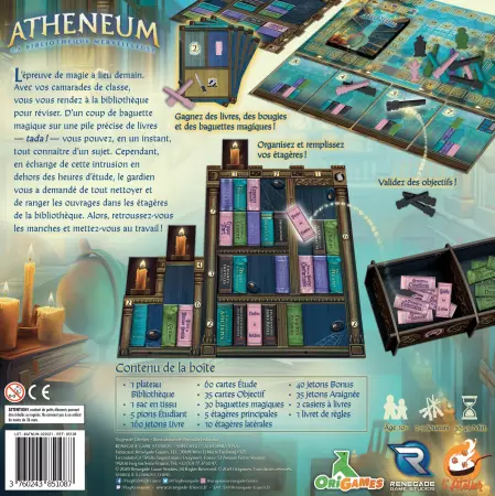Réf. : JDPRGS040 Dans Atheneum : La Bibliotheque merveilleuse, vous incarnez des étudiants en magie chargés de ranger une grande bibliothèque. II faudra alors concilier obéissance aux consignes, préférences littéraires personnelles, remplissage des étagères, éclairage et surveillance des autres joueurs, qu'il ne faudrait surtout pas aider a mieux ranger leurs rayonnages que vous !