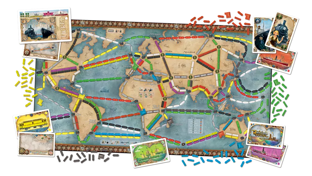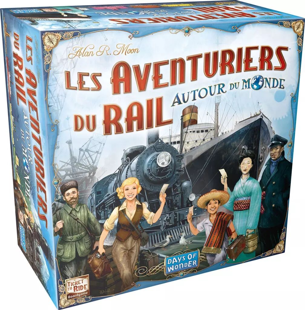 Mettez les voiles vers de nouveaux horizons ! Les Aventuriers du Rail : Autour du monde est une nouvelle version du célèbre jeu d'aventures ferroviaires. Les joueurs rassemblent des cartes de différents types (trains et bateaux) pour s'emparer des voies ferrées et maritimes sur un plateau double-face, richement illustré représentant la carte du monde d'un côté et celle des Grands Lacs d'Amérique du Nord de l'autre. La série des Aventuriers du Rail passe à la vitesse supérieure avec ces deux nouveaux plateaux, qui conviendront aussi bien aux familles qu'aux vétérans du jeu.