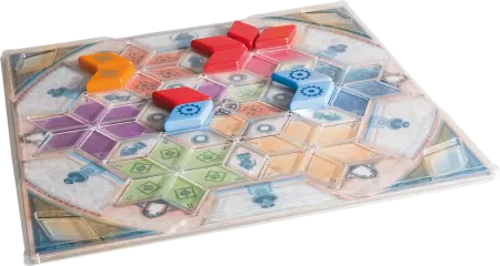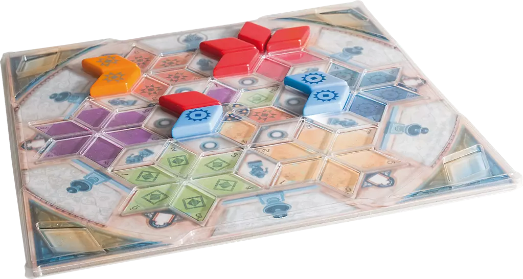 La mosaïque de cristal, ce sont des caches en plastique thermoformés que vous placez sur votre plateau de jeu. Ils empêchent les tuiles d'être accidentellement déplacées. Quatre gabarits sont inclus dans la boîte.