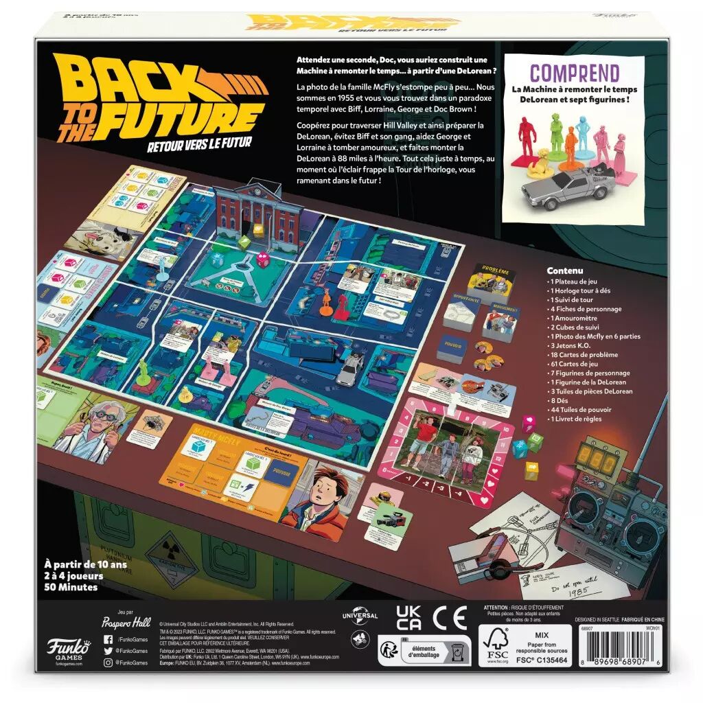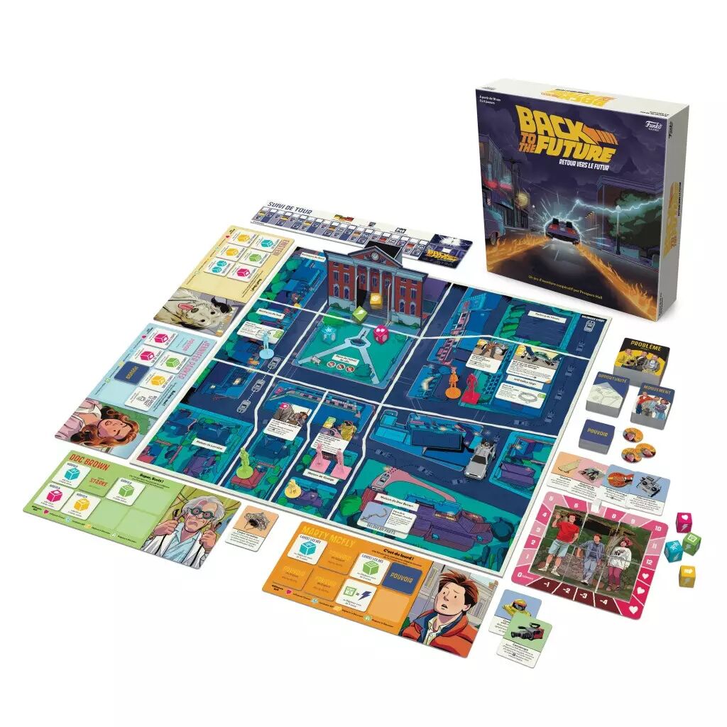 Funko Games soigne la production : figurines distinctes et faciles à manipuler, dés colorés agréables à lancer, plateau central illustré avec précision et une mini DeLorean qui attire tous les regards. Le livret de règles, présenté comme un comic, facilite la prise en main et ajoute à l’immersion. Les nombreux accessoires (cartes Opportunité, Problème, tuiles Pouvoir, photo de famille, etc.) garantissent une expérience riche, fluide et visuellement réussie.