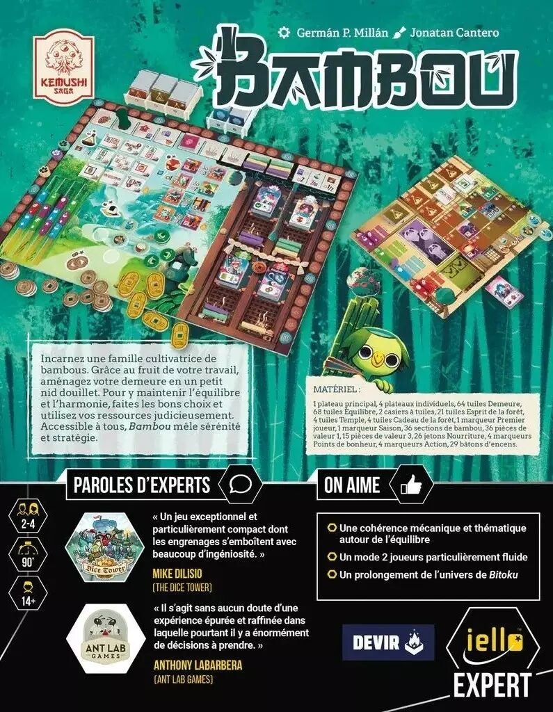 Bambou bénéficie d'un matériel de qualité et d'une direction artistique somptueuse. Les illustrations sont magnifiques et les composants sont de grande qualité. Le jeu est un véritable plaisir pour les yeux et pour l'esprit.
