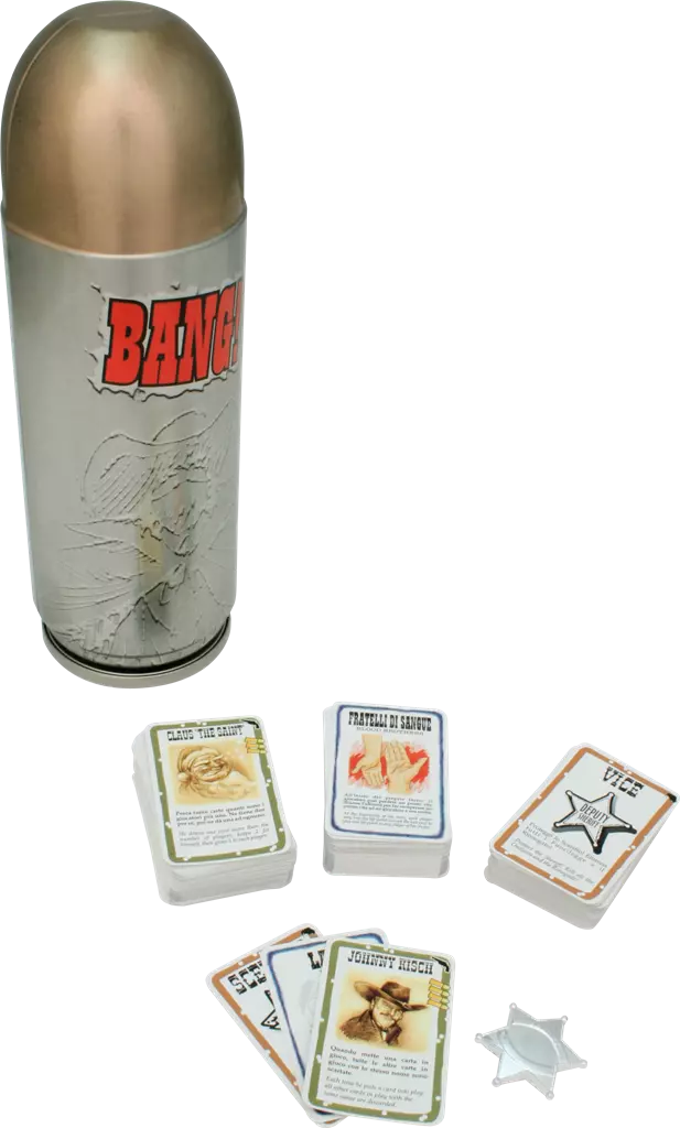 La Bullet contient Bang! le jeu de base, les extensions High Noon, Dodge City et Pour une poignée de cartes en plus, 2 nouvelles cartes pour High Noon et trois personnages inédits, une étoile de shérif, un livret de règles.