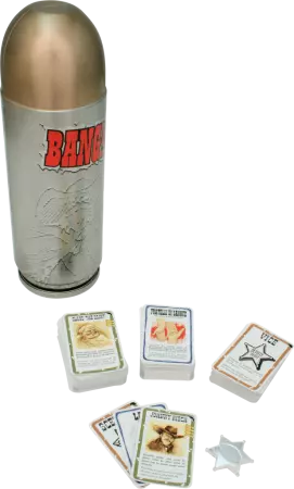 Bang! the Bullet réunit les extensions High Noon , Dodge City et Pour une poignée de cartes en plus, avec une étoile pour le shérif dans une balle géante pour égayer les ludothèques !