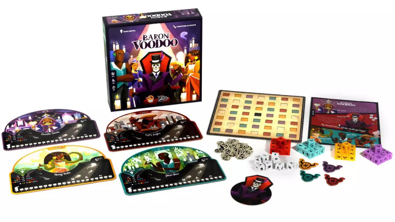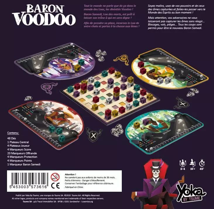 Tout le monde ne parle que de ça dans le monde des Loas, les divinités Voodoo ! Baron Samedi, Loa des morts, est prêt à laisser son trône à qui en sera digne ! Afin de prendre sa place, incarnez le Loa de votre choix et partez à la chasse aux âmes ! Jouez vos pouvoirs vaudous et capturez les dés sur le plateau central en déplaçant les vôtres dans une mécanique proche de celle du solitaire. Une fois le dé capturé et placé sur votre plateau personnel, plusieurs options s'offrent à vous : changer sa face, appliquer son effet, rejouer,... et bien entendu réaliser des combinaisons de dés aux faces ou couleurs identiques afin de scorer. La stratégie sera importante afin d'être le nouveau Baron Samedi !
