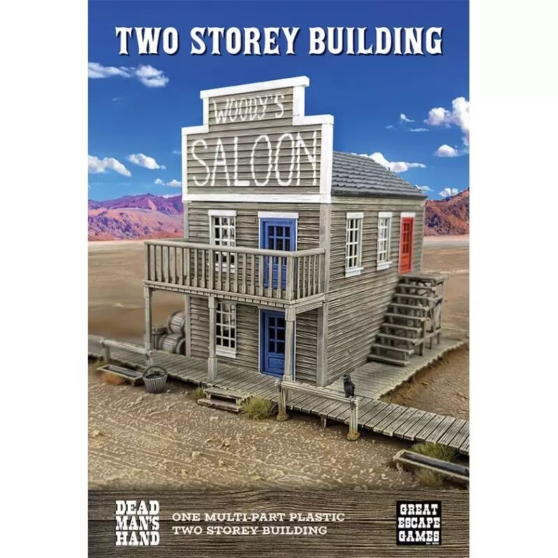 Un bâtiment 2 étages ? C'est naturellement un saloon. Bar au rez-de-chaussée, chambres à l'étage. Imaginez : vos gunfighters entrent par les portes battantes. Ils grimpent l'escalier intérieur. Ils se retrouvent sur le balcon à l'étage, face à face avec leurs ennemis. C'est hollywoodien, c'est dramatique.