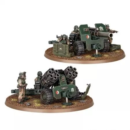 Ce kit plastique permet d'assembler deux Équipes d'Artillerie, des plateformes mobiles qui forment ensemble une Batterie d'Artillerie. Chaque Équipe d'Artillerie est constituée d'un artilleur et de deux observateurs et chargeurs, pouvant utiliser selon votre préférence un lance-roquettes Malleus à la cadence de tir dévastatrice, un canon de campagne Bombast pouvant tirer en cloche ou un canon laser lourd parfait pour éventrer les véhicules. Les observateurs et les chargeurs sont également armés de fusils laser et de grenades Frag. Les membres des équipes peuvent recevoir de nombreuses options esthétiques, dont un choix de douze têtes différentes et toutes sortes de bras, de munitions, de poses et d'accessoires. Vous pouvez également assembler les kits comme s'ils étaient en train d'être tractés, sans artilleur installé au poste de tir.