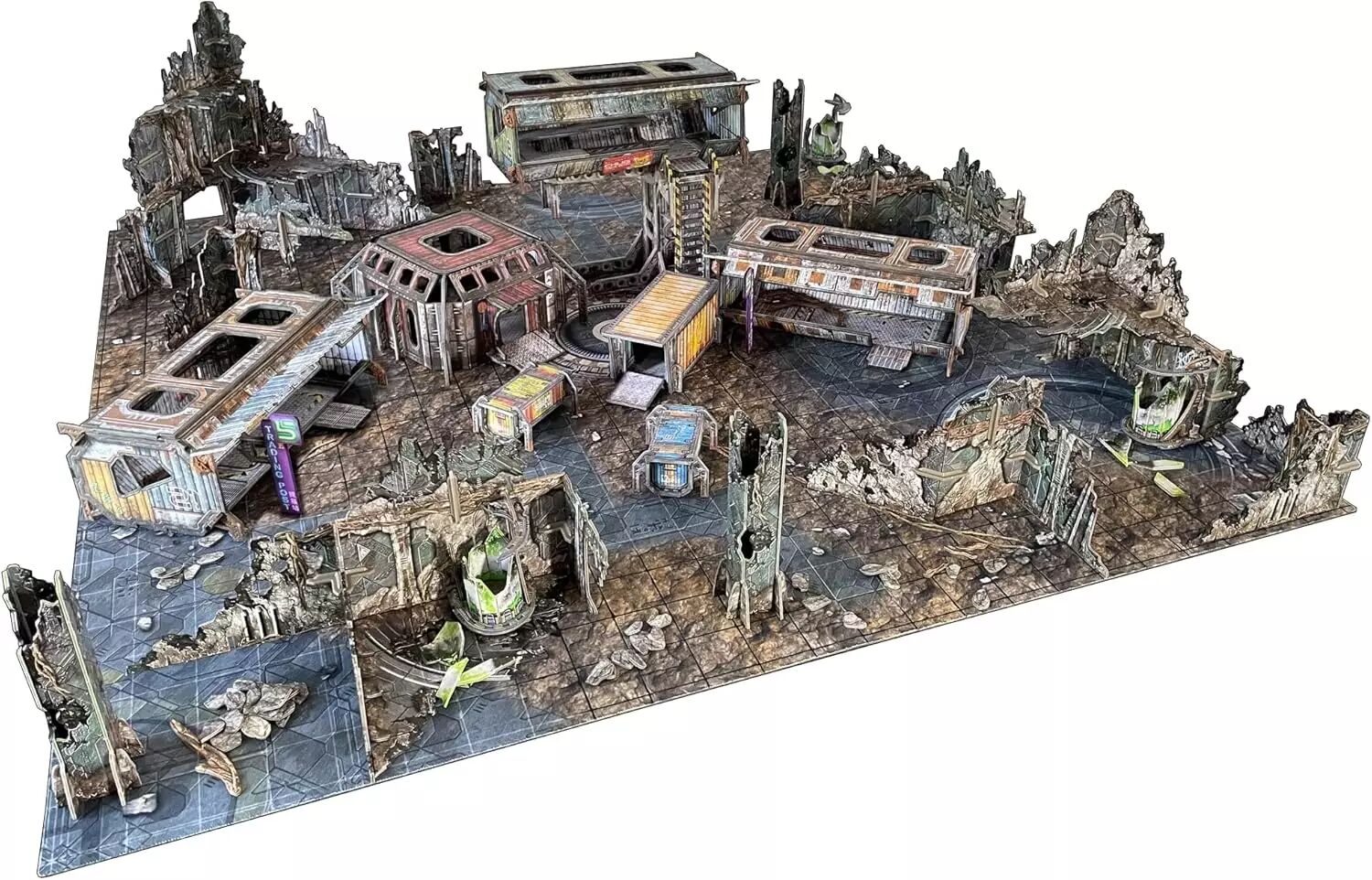 Réf. : BSTSFC007 Construisez une colonie commerciale - ce set terrain 3D pré-peint contient 3 grands conteneurs commerciaux modulaires, 1 structure d'échafaudage, 2 caisses de ravitaillement, 1 caisse de cargo, 1 table, 2 chaises, 9 panneaux/enseignes, 1 tapis neoprène 2'x2' et des éléments de catacombes d'aliens en ruines pour créer une colonie multi-niveaux.
