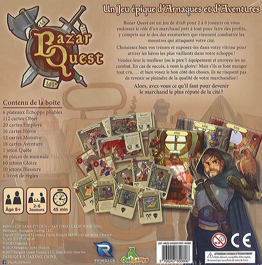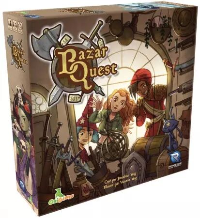 Bazar Quest est un jeu de draft et d'opportunisme pour 2 à 6 joueurs. Choisissez bien quels trésors (ou babioles) exposer dans votre vitrine, pour attirer les héros dans votre échoppe. Vendez-leur votre meilleur (ou pire !) équipement et envoyez-les au combat. En cas de succès, à vous la gloire ! Mais s'ils se font manger tout cru... tant mieux, pas de SAV ! Attention quand même à ne pas perdre l'ensemble des héros avant qu'ils n'aient chassé les trois monstres, sinon c'est la faillite pour tous les joueurs...