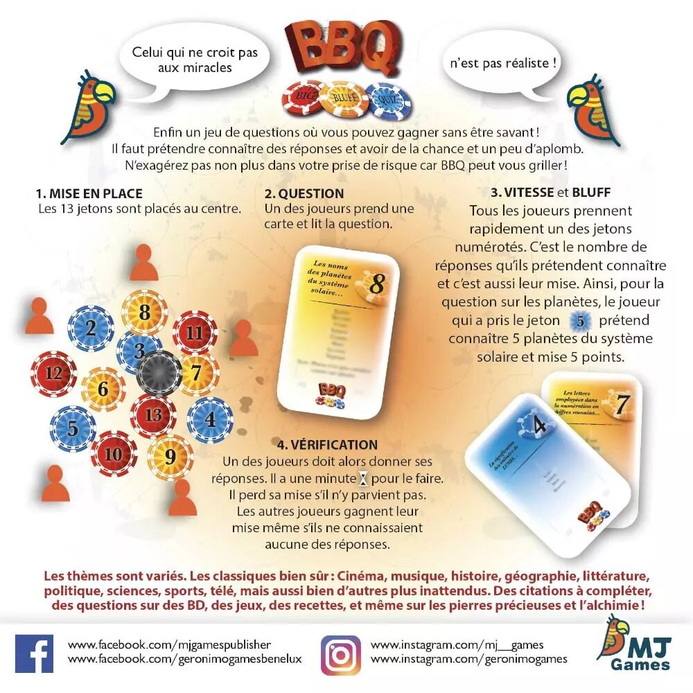 Big Bluff Quiz (BBQ) est un jeu unique et captivant qui a été conçu pour s’amuser. C’est un jeu de questions – ou plutôt de réponses – où vous pouvez gagner sans être savant. Il faut prétendre connaître des réponses et avoir de la chance et un peu d’aplomb. N’exagérez pas non plus dans votre prise de risque car BBQ peut vous griller!
