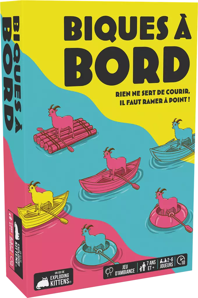 Dans Biques à Bord, chaque joueur doit poser une carte chèvre en toute rapidité. Quand un troupeau de trois chèvres identiques ou de trois couleurs identiques apparaît, la course pour attraper la bouée de sauvetage commence. La tension est palpable, entre bluff et intuition, chaque seconde comptant pour ne pas se faire noyer.