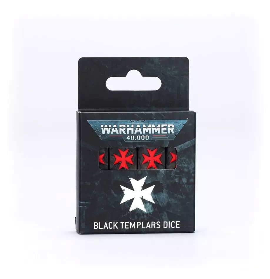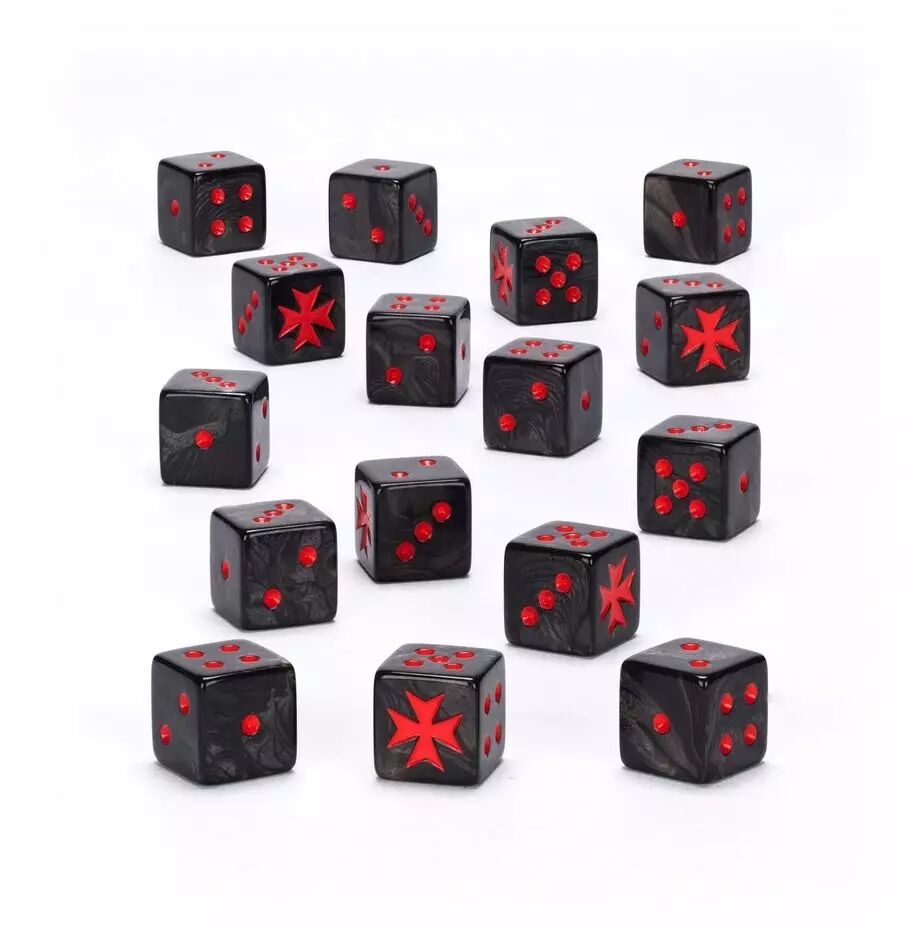 Ce set de 16 dés aux arêtes carrées sur le thème des Black Templars s'utilise dans les parties de Warhammer 40,000. Ils sont moulés en plastique acrylique à volutes noirs et gris, avec des marquages rouges, et mesurent 16mm de côté. Les faces 1 à 5 arborent des marquages traditionnels, tandis que la face du 6 est décorée de l'icône fervente des Black Templars.