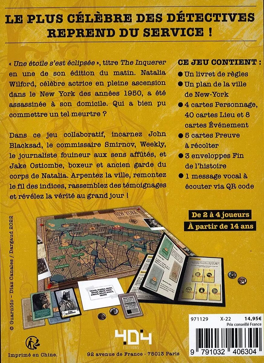 Dans ce jeu coopératif haletant pour 2 à 4 joueurs, les joueurs incarnent les célèbres personnages de Blacksad ! Ils devront récupérer des indices et mener des interrogatoires aux quatre coins de New York, des bas-fonds de la ville aux quartiers huppés, mais attention ! L’assassin est peut-être sur vos traces…