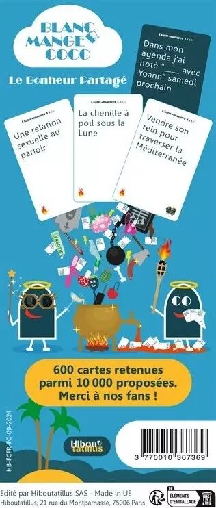 Grâce à des règles expliquées en 1min, on peut se lancer immédiatement dans une partie de Blanc Manger Coco. À l’apéro ou en soirée, c’est le jeu d’ambiance parfait pour rire de tout ! Avec ses 600 cartes, chaque partie est unique. Et pour aller encore plus loin, vous pouvez combiner toutes les boîtes de Blanc Manger Coco entre elles !