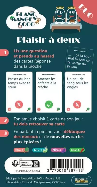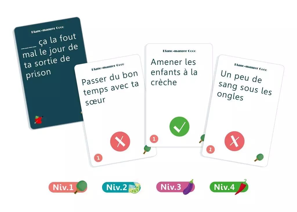 Grâce à des règles expliquées en 1min, on peut se lancer immédiatement dans une partie de Blanc Manger Coco. À l’apéro ou en soirée, c’est le jeu d’ambiance parfait pour rire de tout ! Avec ses 600 cartes, chaque partie est unique. Et pour aller encore plus loin, vous pouvez combiner toutes les boîtes de Blanc Manger Coco entre elles !